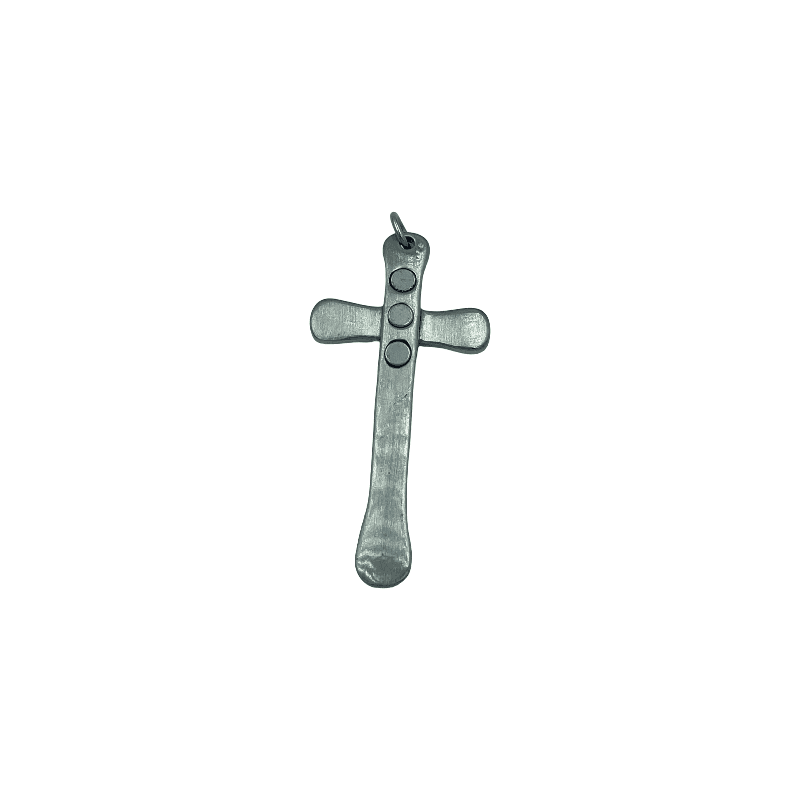 Kors vedhæng med nubret overflade og messing prik, der er 3 magneter bag på.